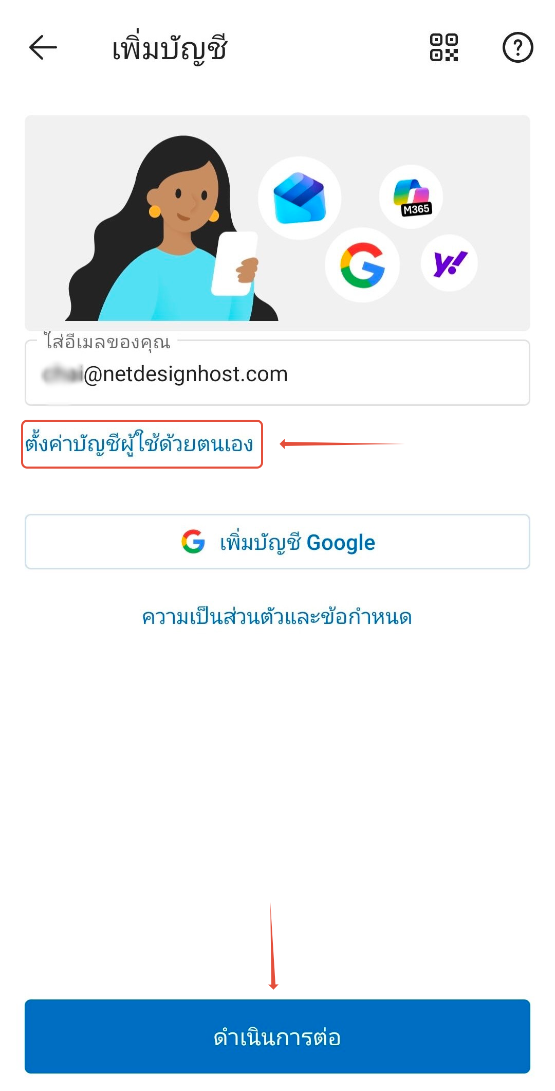 ตัวอย่าง การตั้งค่าอีเมลในแอป Outlook บนมือถือ (Android & iOS)