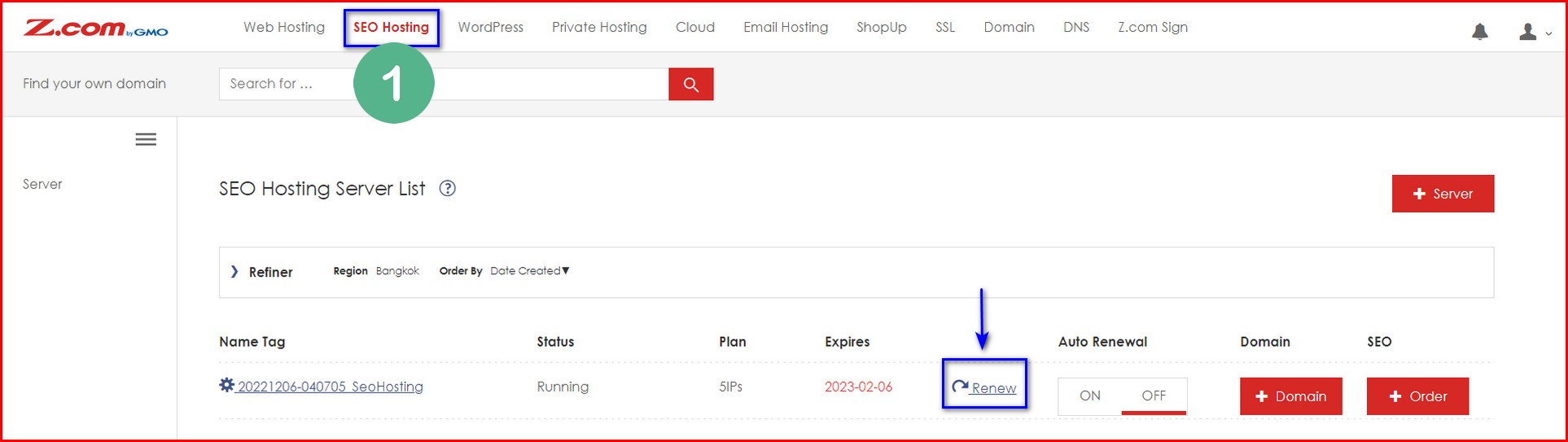 ขั้นตอนการต่ออายุ SEO Hosting เข้าสู่ระบบสมาชิกแล้วคลิกที่เมนูด้านบน “SEO Hosting” แล้วคลิกปุ่ม “Renew” ที่ต้องการต่ออายุเลือกระยะเวลาที่ต้องการต่ออายุแล้วคลิกปุ่มสีแดง “Yes”เลือกช่องทางการชำระค่าบริการและคลิกปุ่มสีแดง “Set” Back to Top