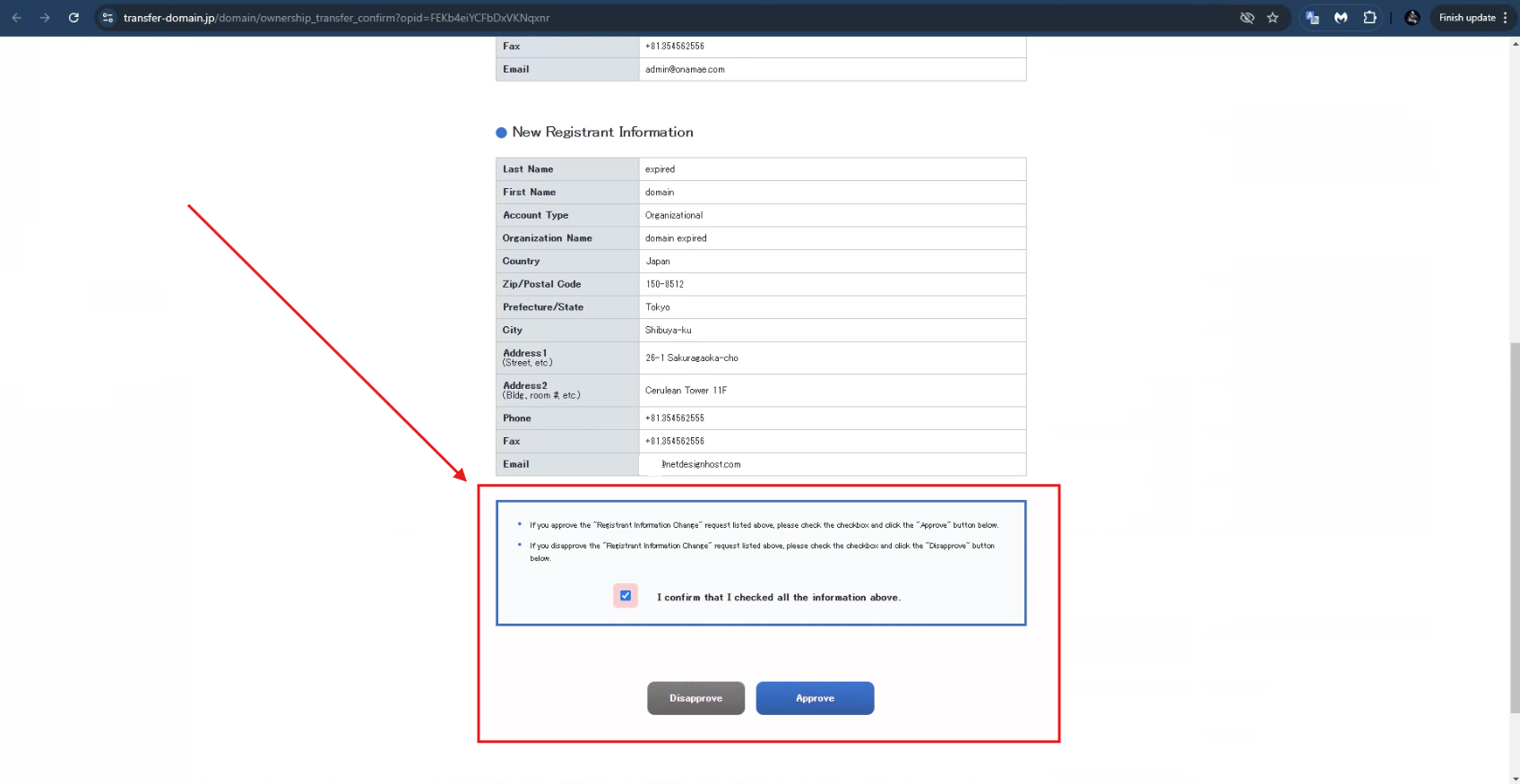 อย่าลืมตรวจสอบข้อมูลที่ถูกต้องหลังจากการแก้ไข เช่น อีเมลหรือที่อยู่ เนื่องจากข้อมูลนี้จะใช้ในการติดต่อหากมีปัญหาหรือการแจ้งเตือนที่เกี่ยวข้องกับโดเมน