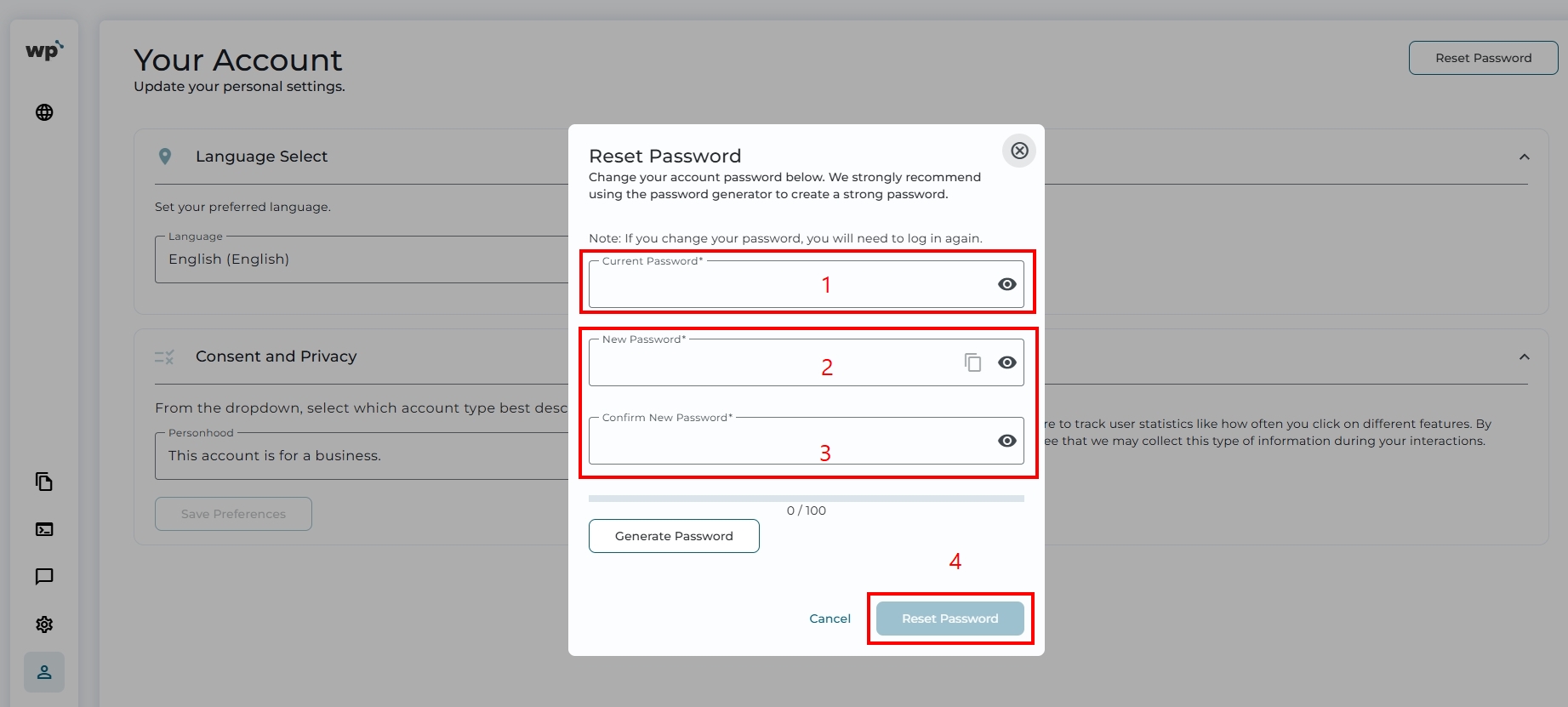 - ดังนั้นจะมี Pop Up เด้งขี้นมาให้ใส่รหัสเดิม ช่องแรก ช่อง 2 และ 3 ให้ใส่รหัสใหม่โดยกรอกเหมือนกัน และ 4 ให้กดปุ่ม Reset Password