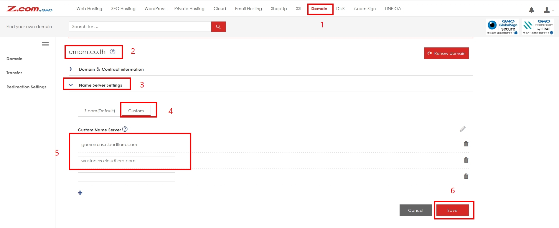 หากจดโดเมนไว้ที่ Z.com ให้ Login เข้าสู่ระบบสามารถทำตามตัวอย่างด้านล่างโดยให้ดูค่า Name Server จาก Cloudflare ตามภาพด้านบนเอามากรอกดังตัวอย่างต่อไปนี้้