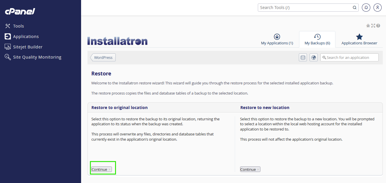 - เลือก "Restore" เพื่อทำการกู้คืนไฟล์เว็บไซต์ เลือก "Continue" จาก Restore to original location เพื่อทับไฟล์เดิม