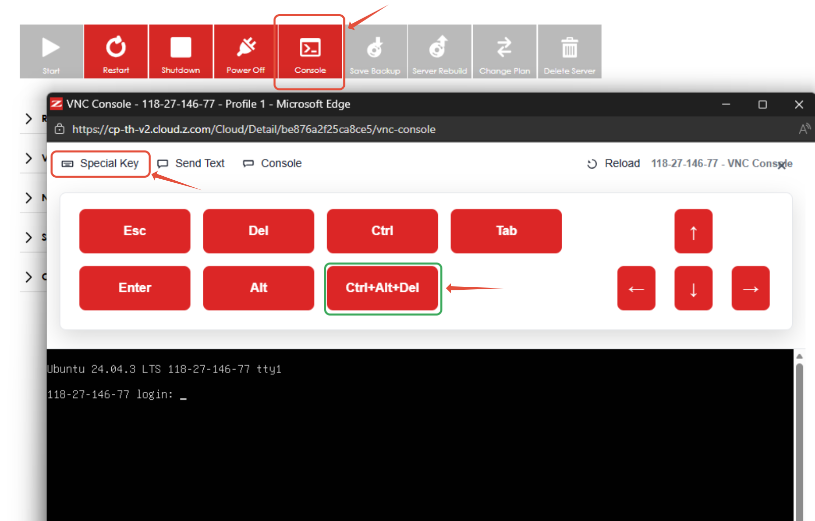 • คลิกที่เมนู Special Key และคลิก Ctrl+Alt-Del ตามภาพ