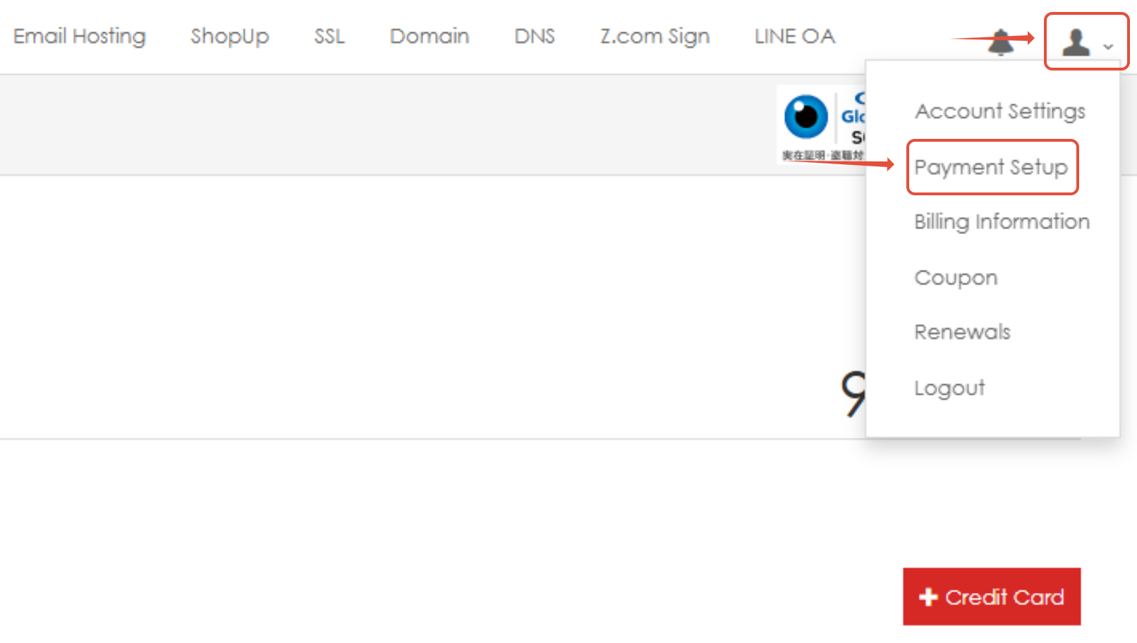 - คลิกที่ไอคอนรูปคนขวามือบนสุด และเลือก “Payment Setup”
