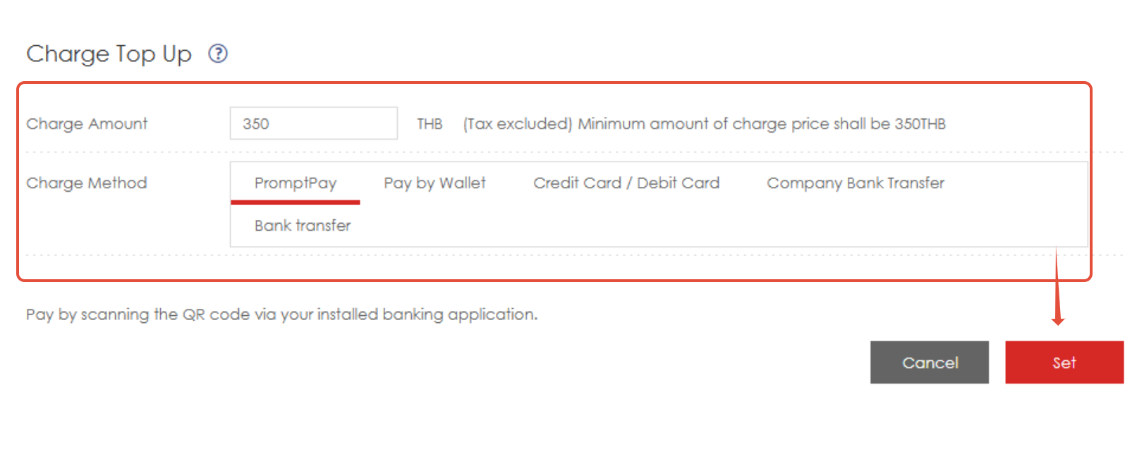 - เลือกช่องทางการชำระค่าบริการ และคลิกปุ่มสีแดง “Set”