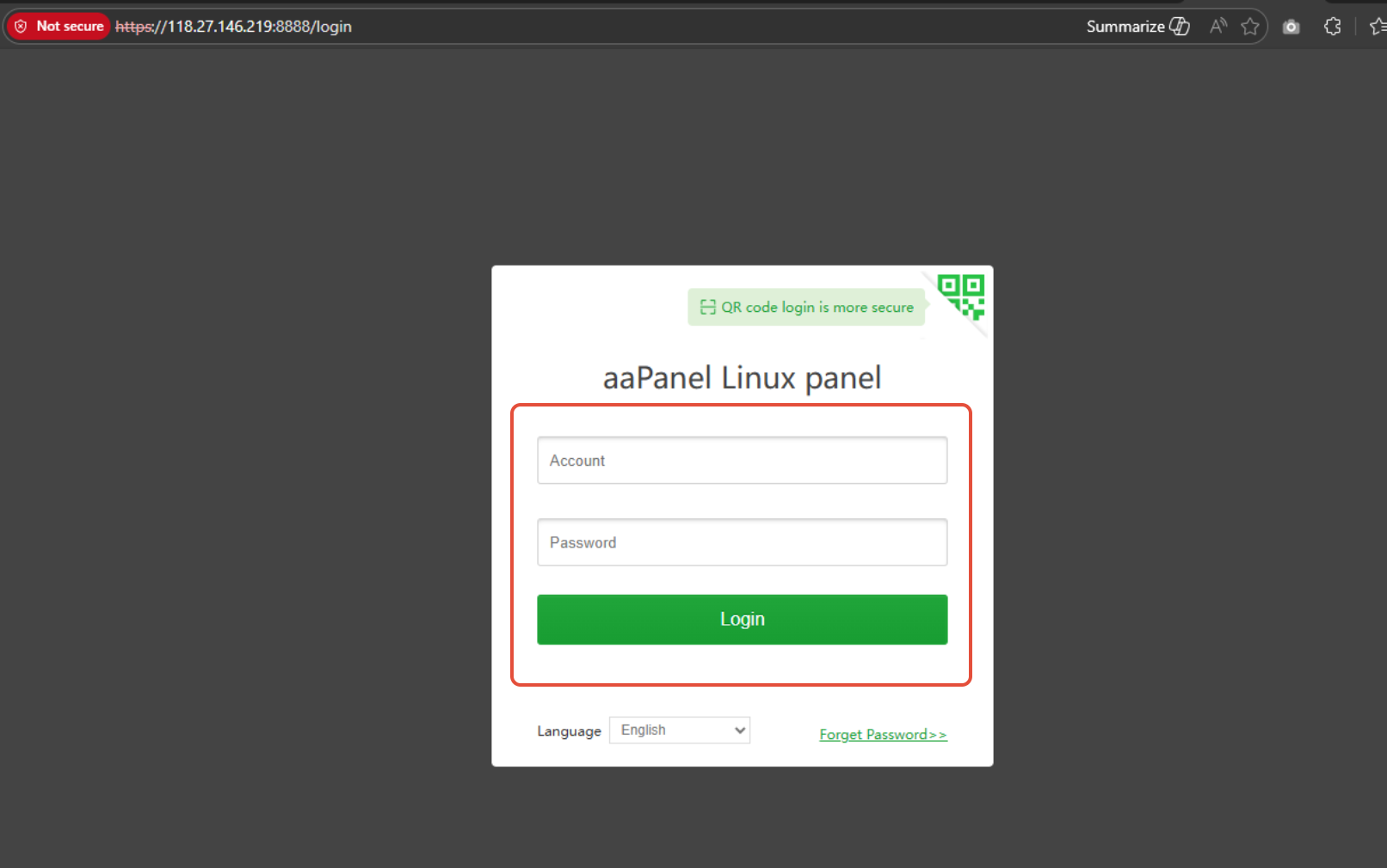 หน้า Login aaPanel โดย aaPanel User จะเป็น administrator และตัว Password นั้นตอนตั้งค่าครั้งแรก