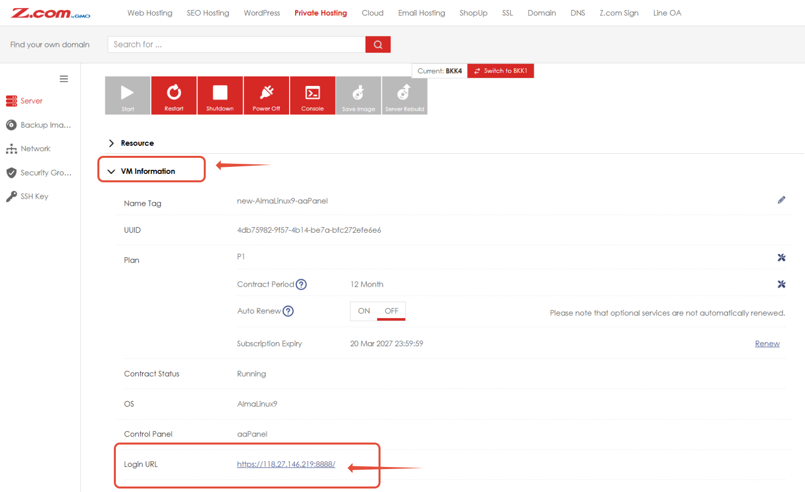 - ไปที่เมนู VM Information เพื่อตรวจสอบ OS และ URL สำหรับเข้า Control Panel