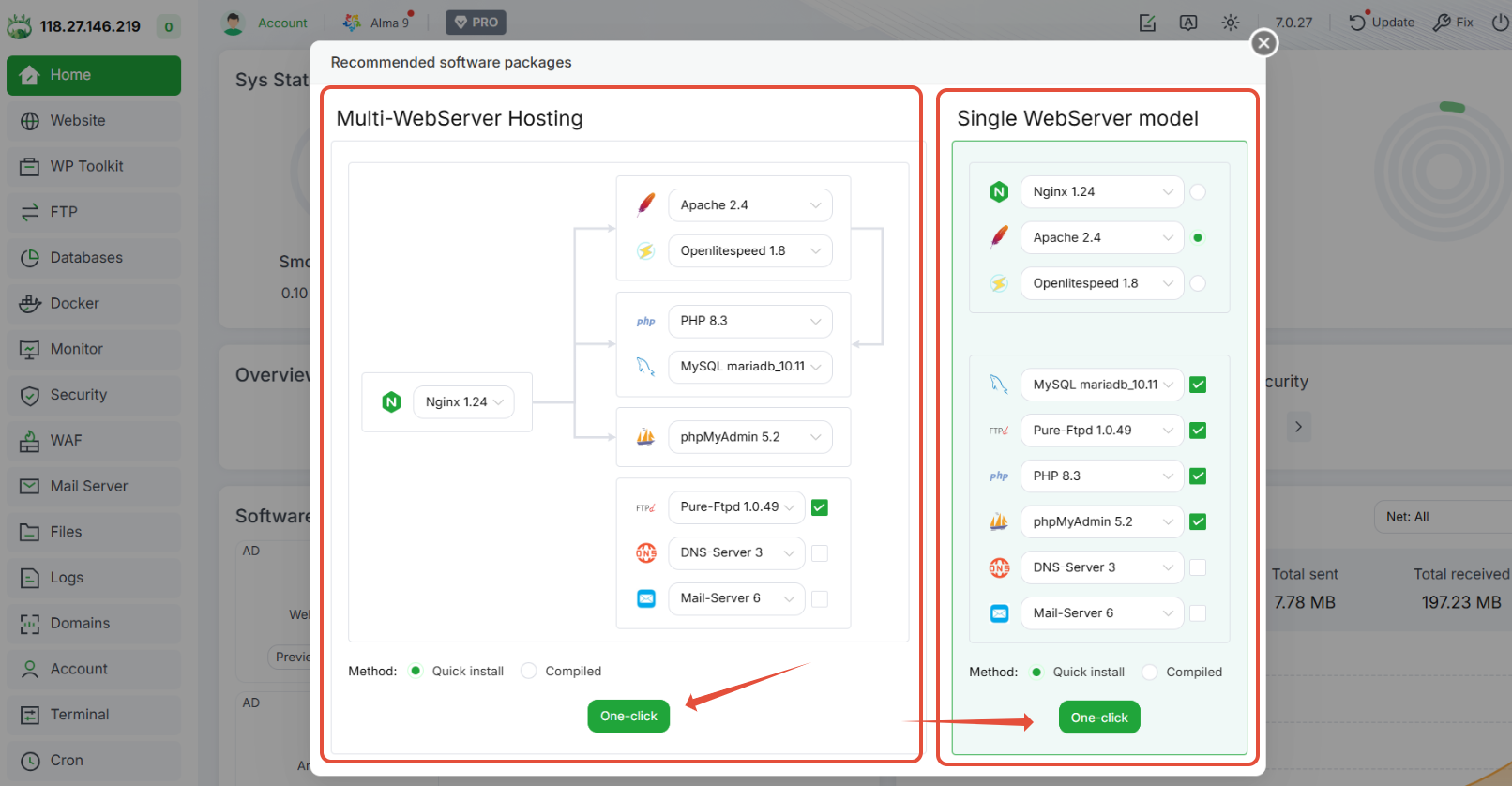 - แนะนำเลือกเป็น Multi-WebServer Hosting และกด one-click เพื่อติดตั้ง