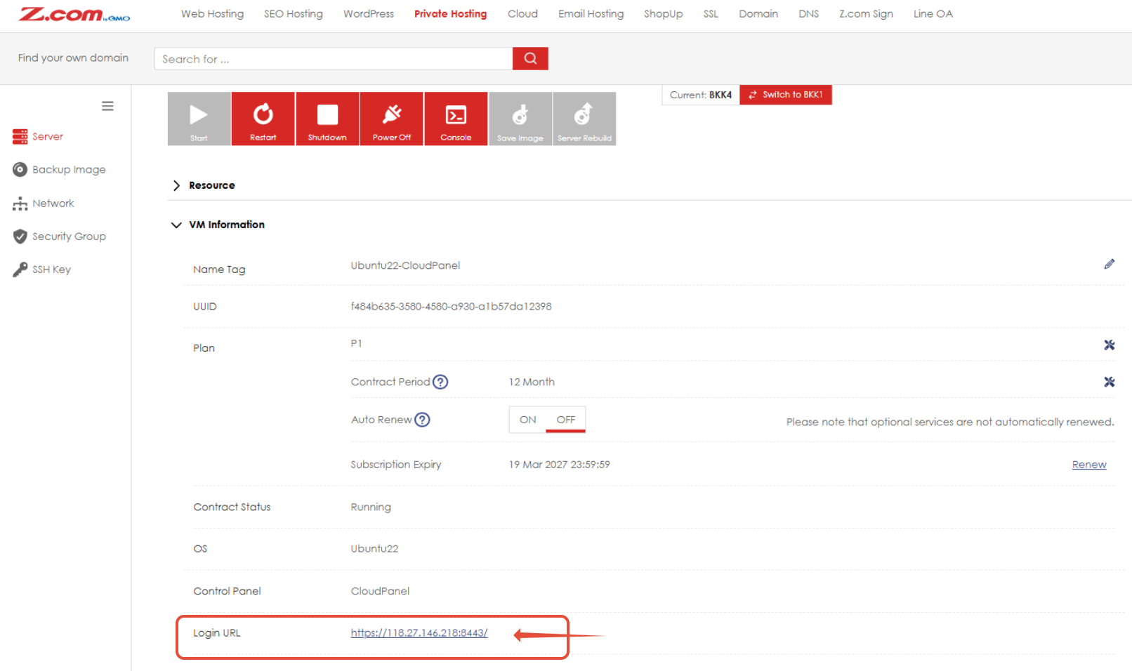 - ไปที่เมนู VM Information เพื่อตรวจสอบ OS และ URL สำหรับเข้า Control Panel