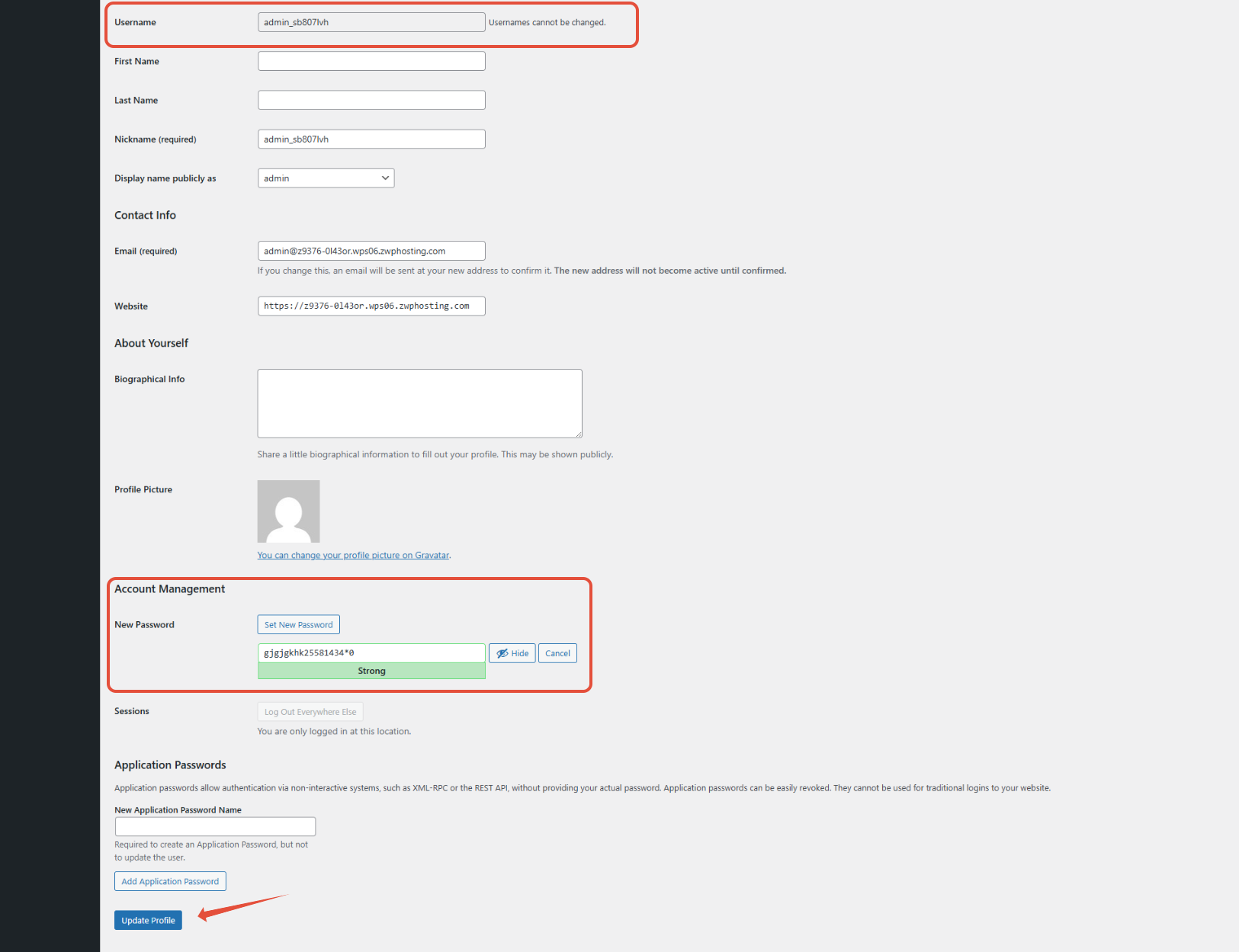 - กำหนดรหัสผ่านใหม่ และคลิก Update Profile